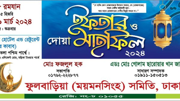 স্টাফ রিপোর্টার(ফুলবাড়িয়া) : ২৯ মার্চ ২০২৪ রোজ শুক্রবার ফুলবাড়িয়া (ময়মনসিংহ) সমিতি, ঢাকা উদ্যোগ এ ইফতার ও দোয়া মাহফিল এর আয়োজন করা হয়। ষ্টার হোটেল এন্ড রেষ্টুরেন্ট (ষ্টার কাবাব) ৪র্থ তলা